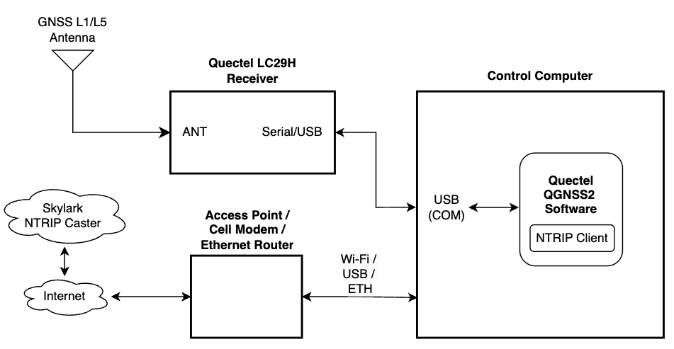 The Skylark corrections are distributed over the Internet using NTRIP protocol. Quectel's QGNSS2 tool features a built-in NTRIP client that operates over an Internet connection (preferably via Ethernet). A reliable Internet connection is required for good navigation performance.